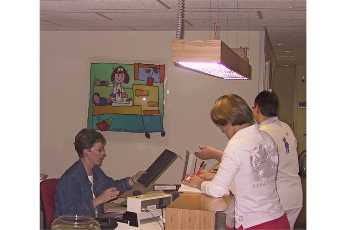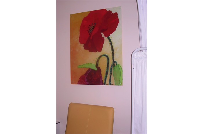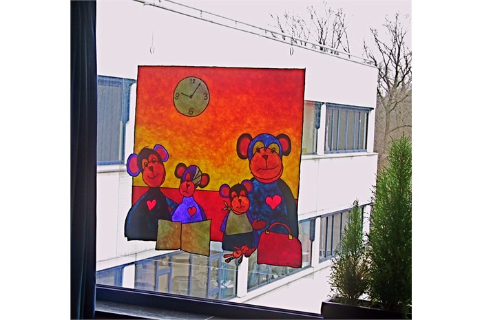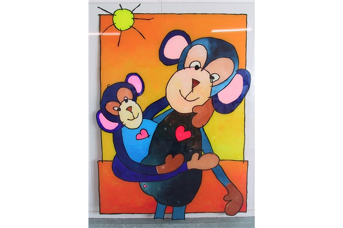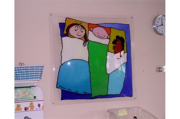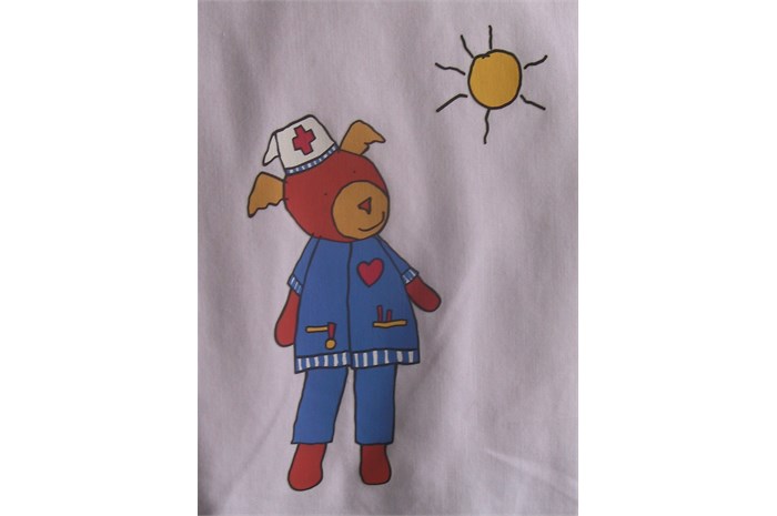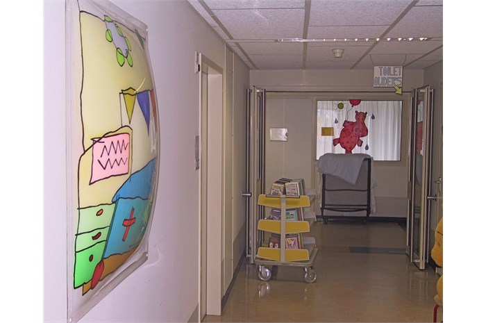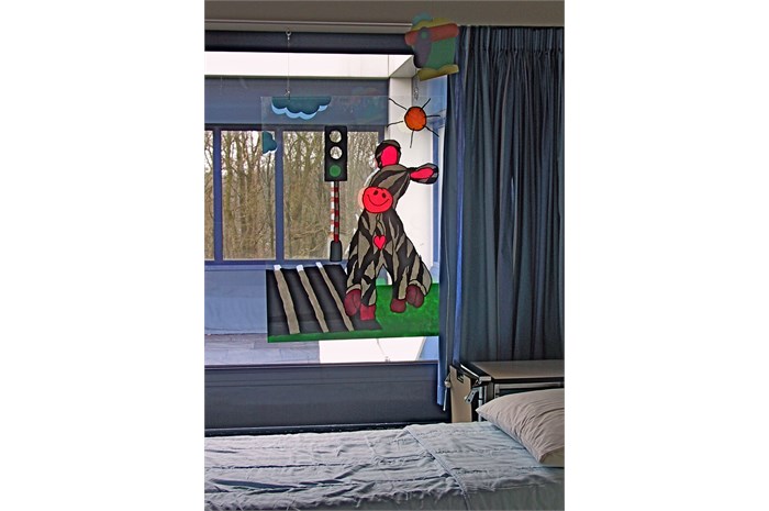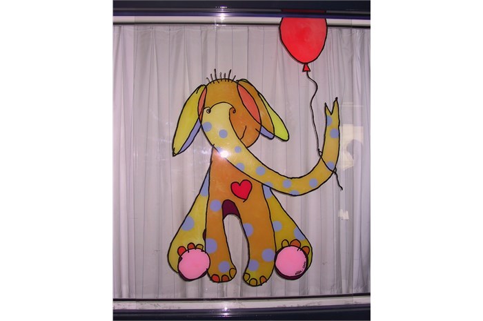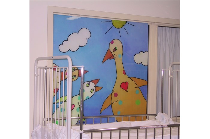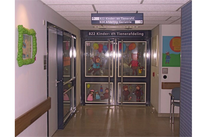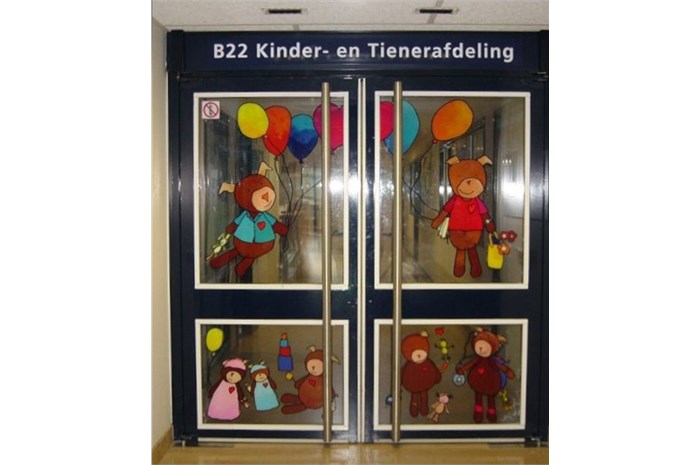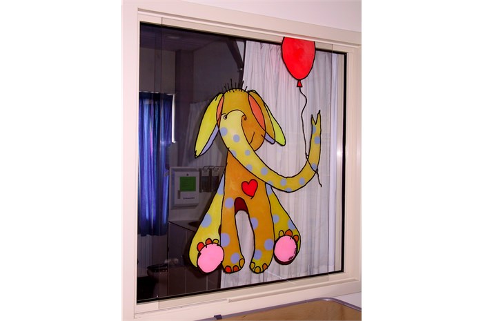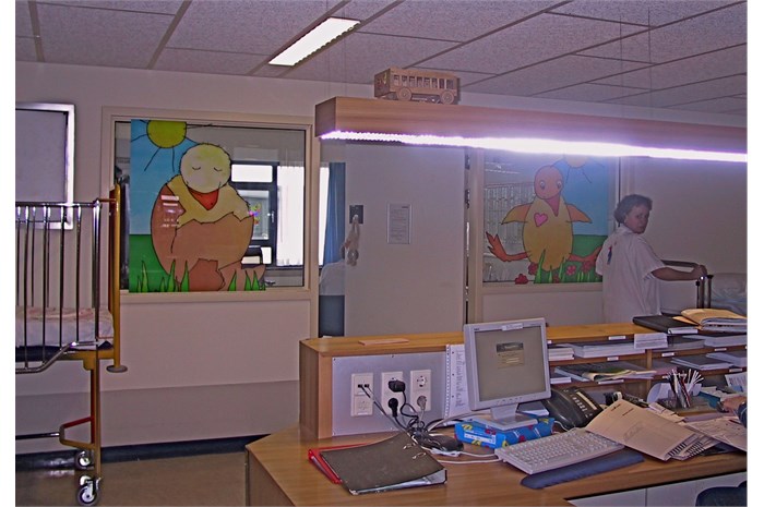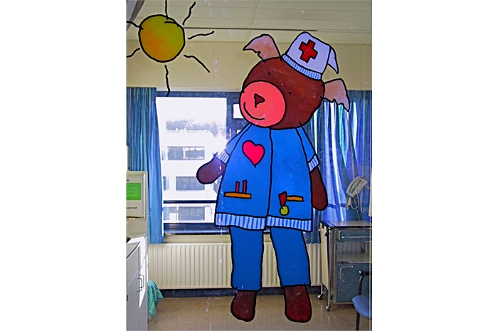 The entire department is restyled and provideds other colors (outside the hospital's corporate identity). The nurses wear a uniform that is designed especially for them. The mascot 'Florry' (also designed by ella) on the back, the sun and the name of the nurse give the white uniform a (child) friendly face. The various paintings fit into a special snap-in window frames. For example, a young patient can choose which image (any animal) he / she wants and where it will hang.