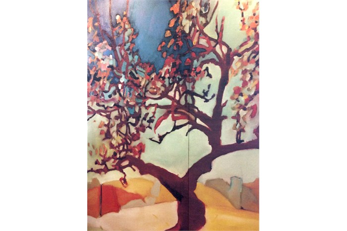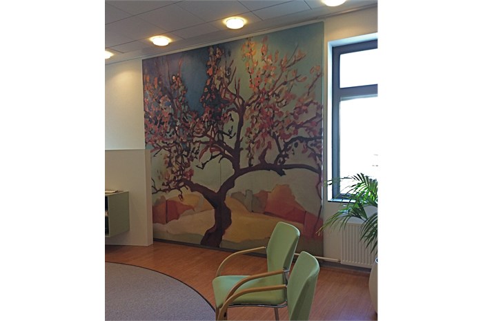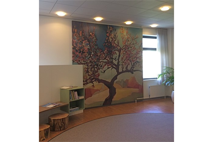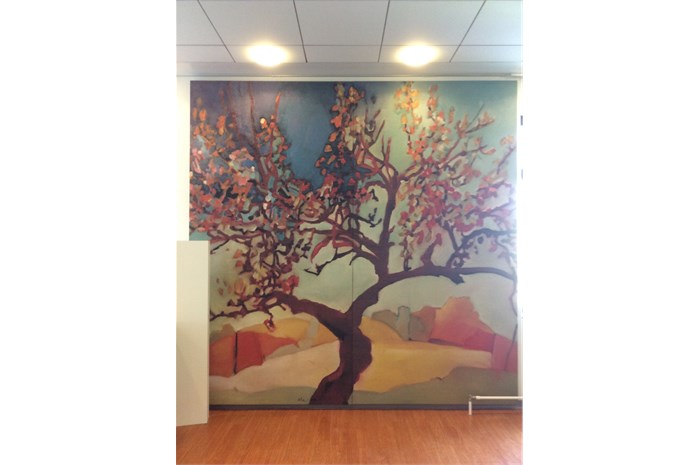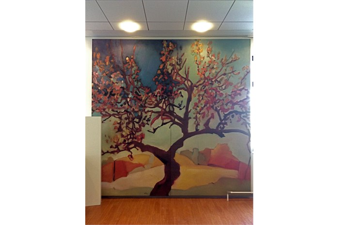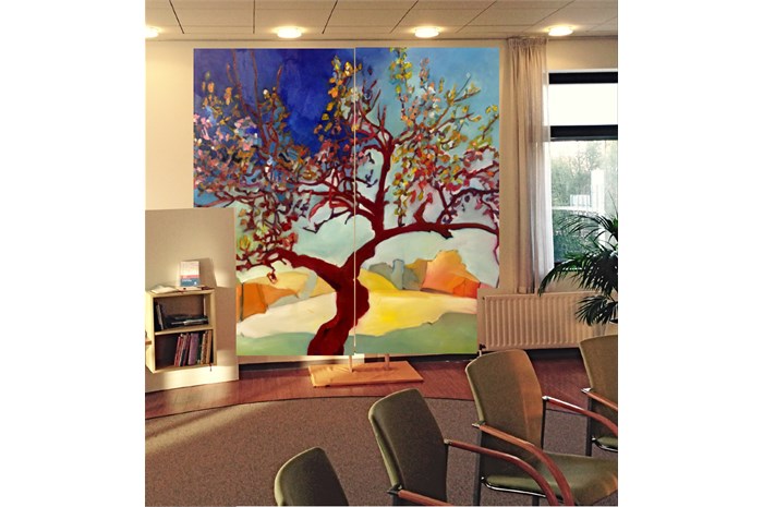 Schilderij: Rode Boom, uitgevoerd in geweven stof ( 2 stukken 150 x 300 mm) gespannen op 2 panelen, zodat het één geheel wordt van 3 bij 3 meter.