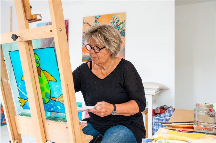 Ella schildert graag buiten, maar heeft haar atelier nodig voor de definitieve uitwerking van haar schilderijen. De laatste tijd schildert ze met olieverf op linnen doek ( al dan niet opgespannen).
