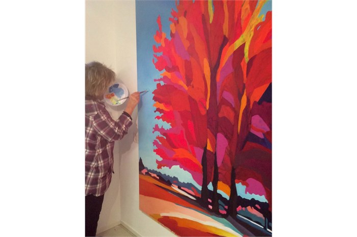 Op opgespannen doeken en soms op grote rollen linnen schildert Ella met olie- of met acrylverf. Laag over laag ( en in omgekeerde volgorde dan op het transparant) komen hier de kleurrijke schilderijen tot stand. De schetsen worden meestal in de buitenlucht gemaakt.